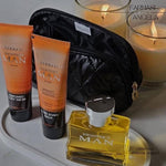 A festive men's set. The set includes: 🎄Eau de Parfum 100 ml 🎄Perfumed shower gel 100 ml 🎄Perfumed body lotion 100 ml 🎄Cosmetics bag. A scent that everyone loves! Sweet, warm, with citrus notes. Men who choose this fragrance will definitely receive many compliments from women. A very long-lasting and lingering aroma. A very stylish perfume that both teenagers and adult men like. It can be described as the scent of a leather interior in an expensive car with citrus notes. Fragrance type: woody spicy Top notes: Orange, Grapefruit, Lemon, Nutmeg, Plum Heart notes: Aquatic notes, Cedar, Lavender Base notes: White wood, Tonka bean, Vanilla, Walnut, Musk